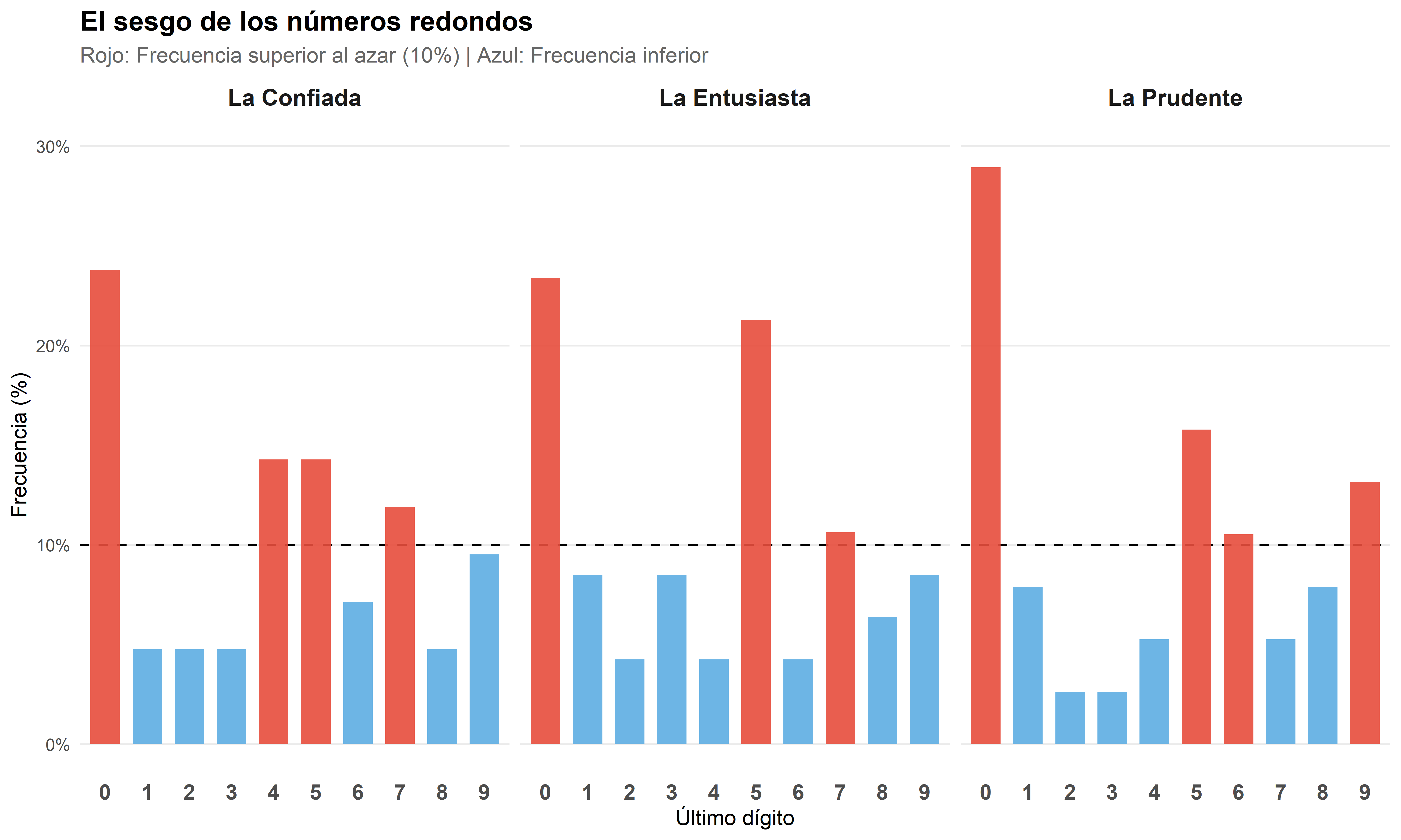 La Prudente se desvió, en promedio, un 4.4% en cada dígito. Su “peor error” fue poner casi un 24% de ceros (un exceso de 14 puntos). Eso no es mala suerte; es un sesgo cognitivo masivo.
