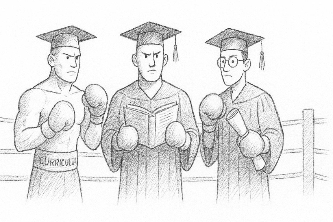 En la esquina opuesta, no uno, sino tres oponentes académicos de prestigio internacional —maestrías con reputación, músculo curricular y pegada brutal— listos para medirse en un sparring sin artimañas.